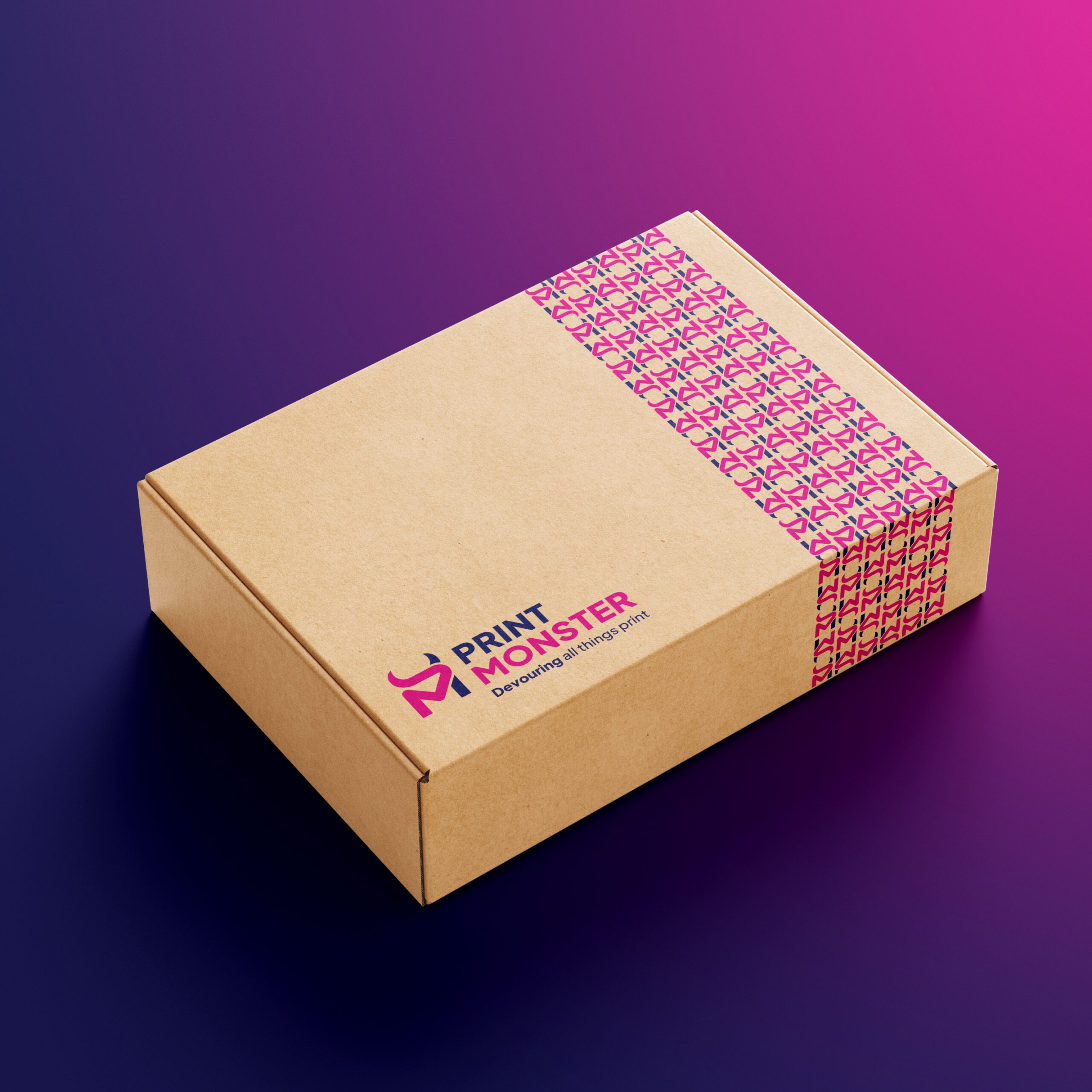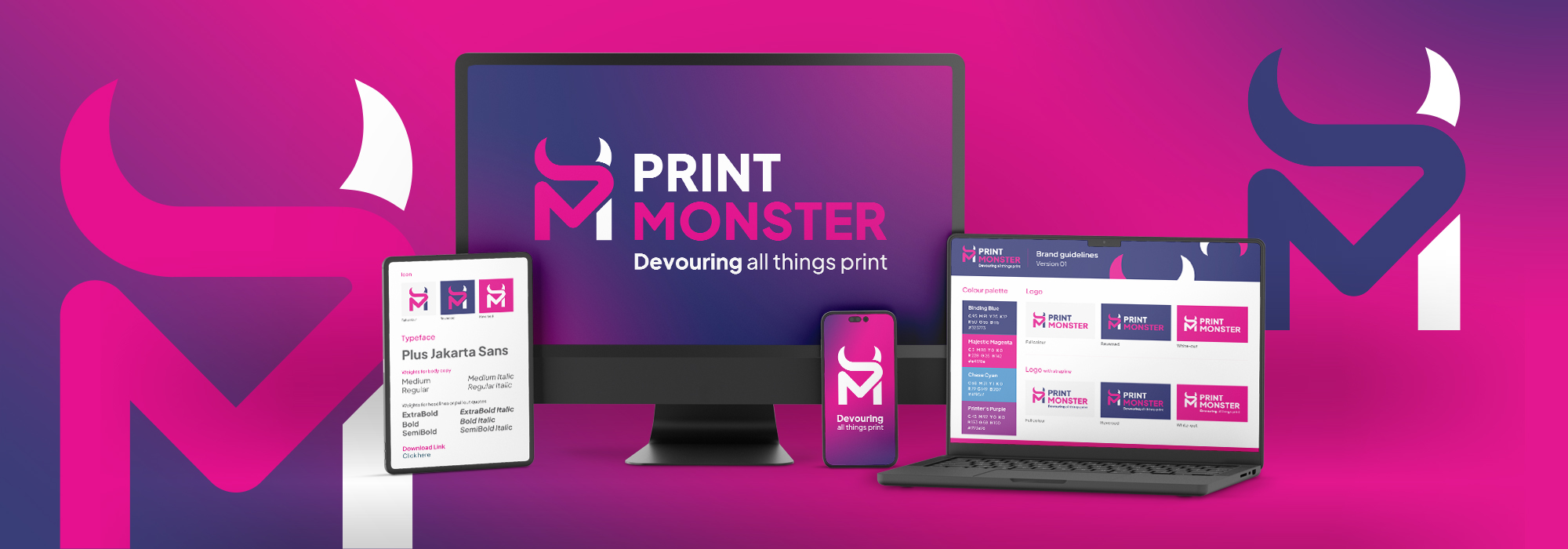 We spotted straight away that the name Print Monster was begging to be unleashed. While competitors played it safe, we leaned into the quirky to help them REALLY stand out. We created a bold new logo built on their initials, woven together with fluid lines that mirror the seamless journey from first call to final print. And then, of course, the quirky horns. A characterful nod to the ‘Monster’ without being too gimmick-y. Colour-wise, we forgot the obvious CMYK cliché. We pushed into rich blues, moody purples and a hot pink accent that brings vibrant personality. The new brand is now professional and slick, but playful and standout. Just like the Print Monster team. The final touch – the strapline beneath – ‘Devouring all things print.’