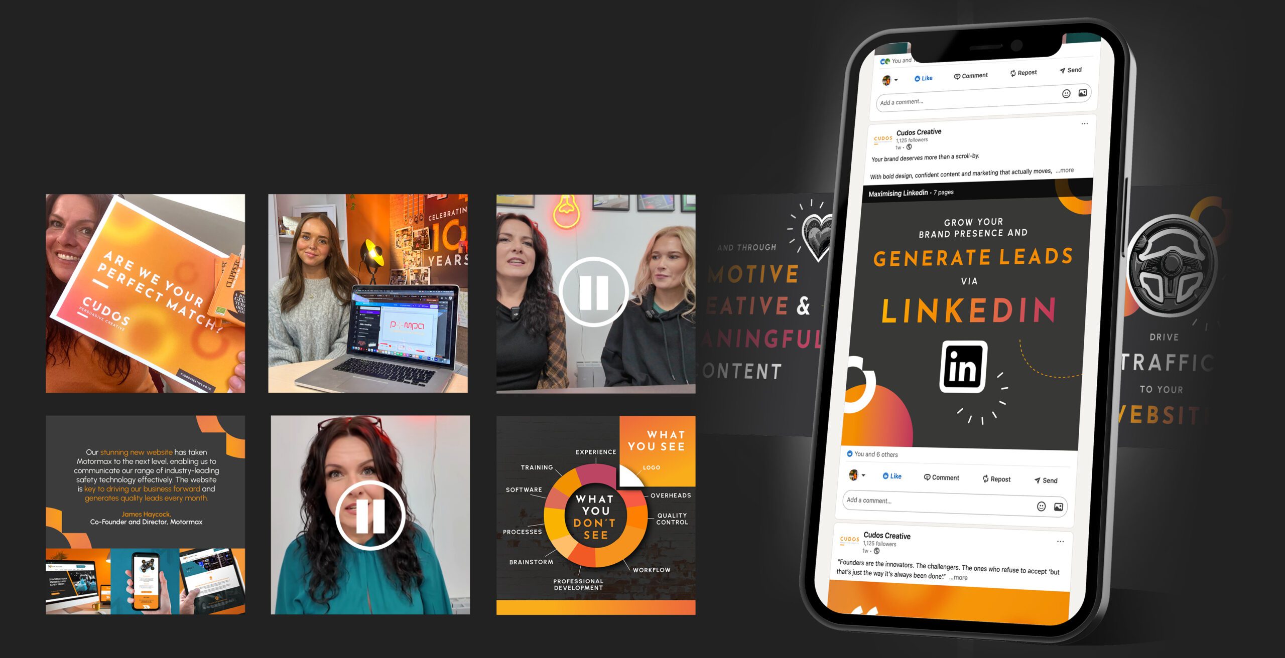 Finally. Content you’re proud to put your name to. Videos. Static posts. Carousels. Visuals. Captured, designed, written and scheduled for you. Content that looks the part. Sounds like you. And earns its place in the feed.